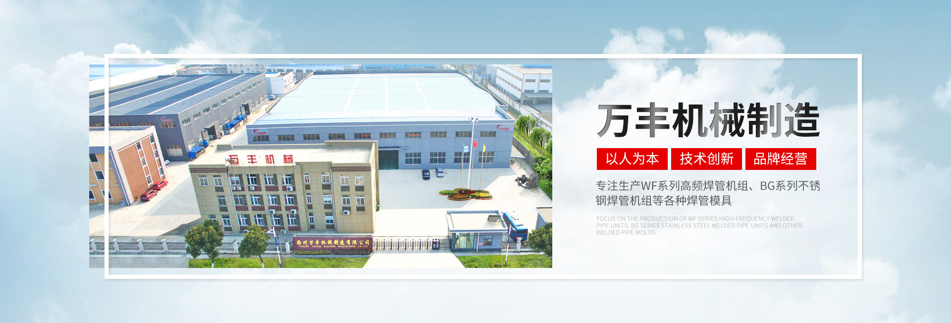 揚州萬豐機械制造有限公司坐落于揚州北郊槐泗工業(yè)園區(qū),占地25000平方米,交通便利,是集開發(fā)、制造、銷售為一 體的焊管機組、模具制造企業(yè)。主要生產(chǎn)WF系列高頻焊管機組;BG系列不銹鋼焊管機組;GW系列型材冷彎成型機組;CQ系列車圈機以及各種焊管模具(12機組至508機組)型材模具。采用ISO9001: 2000國際質(zhì)量標(biāo)準(zhǔn),擁有完善的質(zhì)量保證體系、嚴(yán)格的管理制度、先進(jìn)的檢測手段和完善的售后服務(wù)隊伍。公司秉承“以人為本、技術(shù)創(chuàng)新、品牌經(jīng)營、追求品質(zhì)”的發(fā)展理念。堅持質(zhì)量立企和品牌興企的發(fā)展戰(zhàn)略與時俱 進(jìn),將人才和先進(jìn)的管理、完善的設(shè)計與服務(wù)相結(jié)合。不斷開發(fā)與創(chuàng)新使我們的產(chǎn)品始終處于同行前列地位,同時也得到國內(nèi)了外廣大用戶的信賴和盛贊。 成功始于誠信,實力鑄就品牌,服務(wù)創(chuàng)造未來。二十一世紀(jì)是科技經(jīng)濟高速發(fā)展的時代。競爭與發(fā)展并存,機遇與挑戰(zhàn)同在。萬豐人將以“忠誠、務(wù)實、拼搏、創(chuàng)新”為企業(yè)精神,以敏銳的目光昂揚的姿勢面向一個更加廣闊的市場和未來。